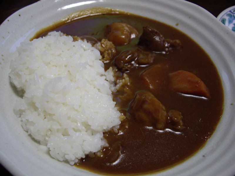 最近は市販のルーを使わないインドカレーに凝ってるけど、きょうはオーソドックスにルー使い。聞いた話によると甘口のルーはメーカーも作るのが難しいらしく(バランスとかかな)、いろんな英知が結集してるそうな。甘口をなめたらいかんぜよ、ということだ。そんなわけで、きょうはいつものジャワカレー中辛(これが一番好き)に、バーモンドカレー甘口を組み合わせてみた。