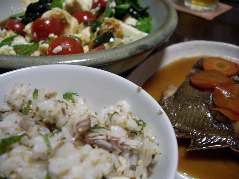 鯵ゴマめし、豆腐サラダ、カレイの煮付け。家庭料理研究家だったあの人のレシピに添って。